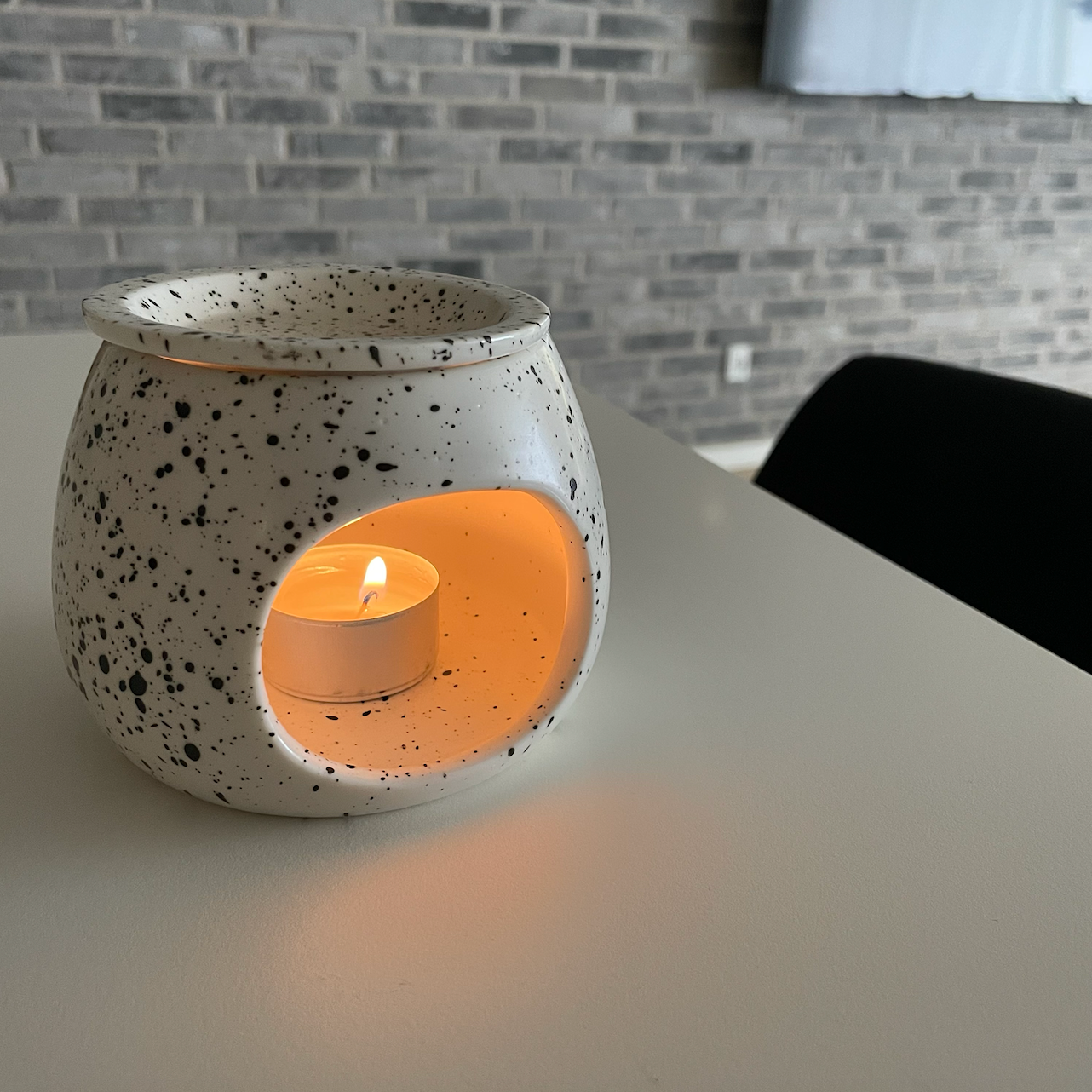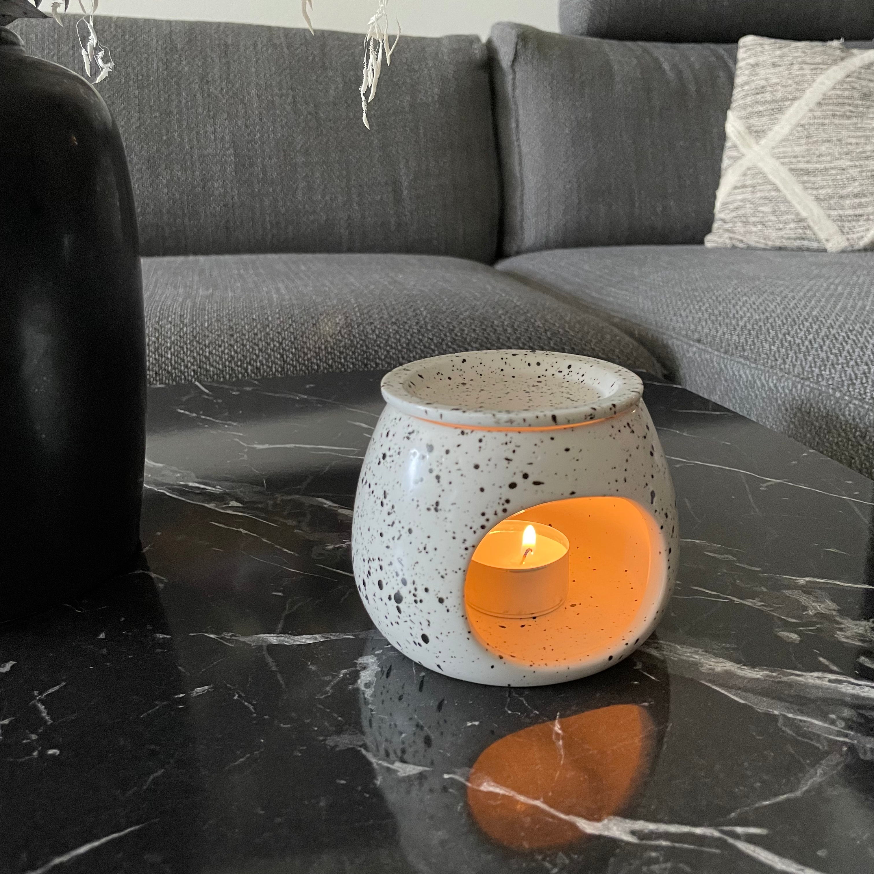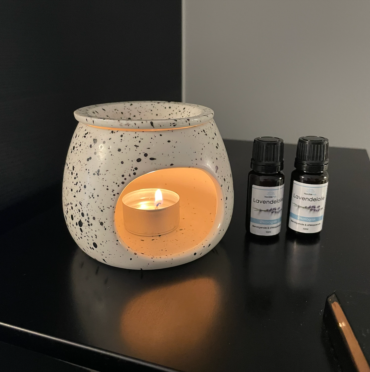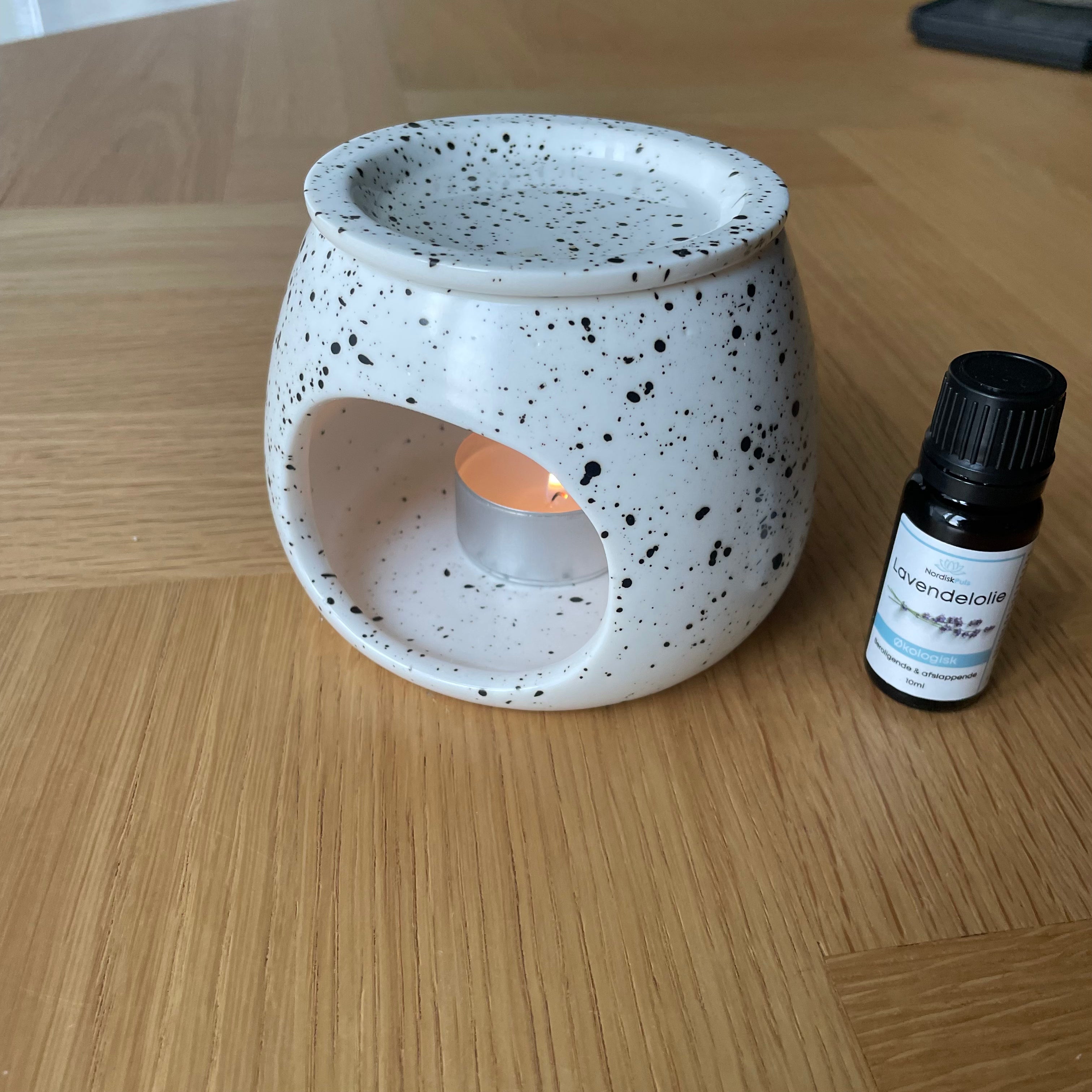 Placer et tændt fyrfadslys i brænderens nederste rum. Varmen fra lyset opvarmer vandet og frigiver langsomt lavendeloliens naturlige duft i rummet.